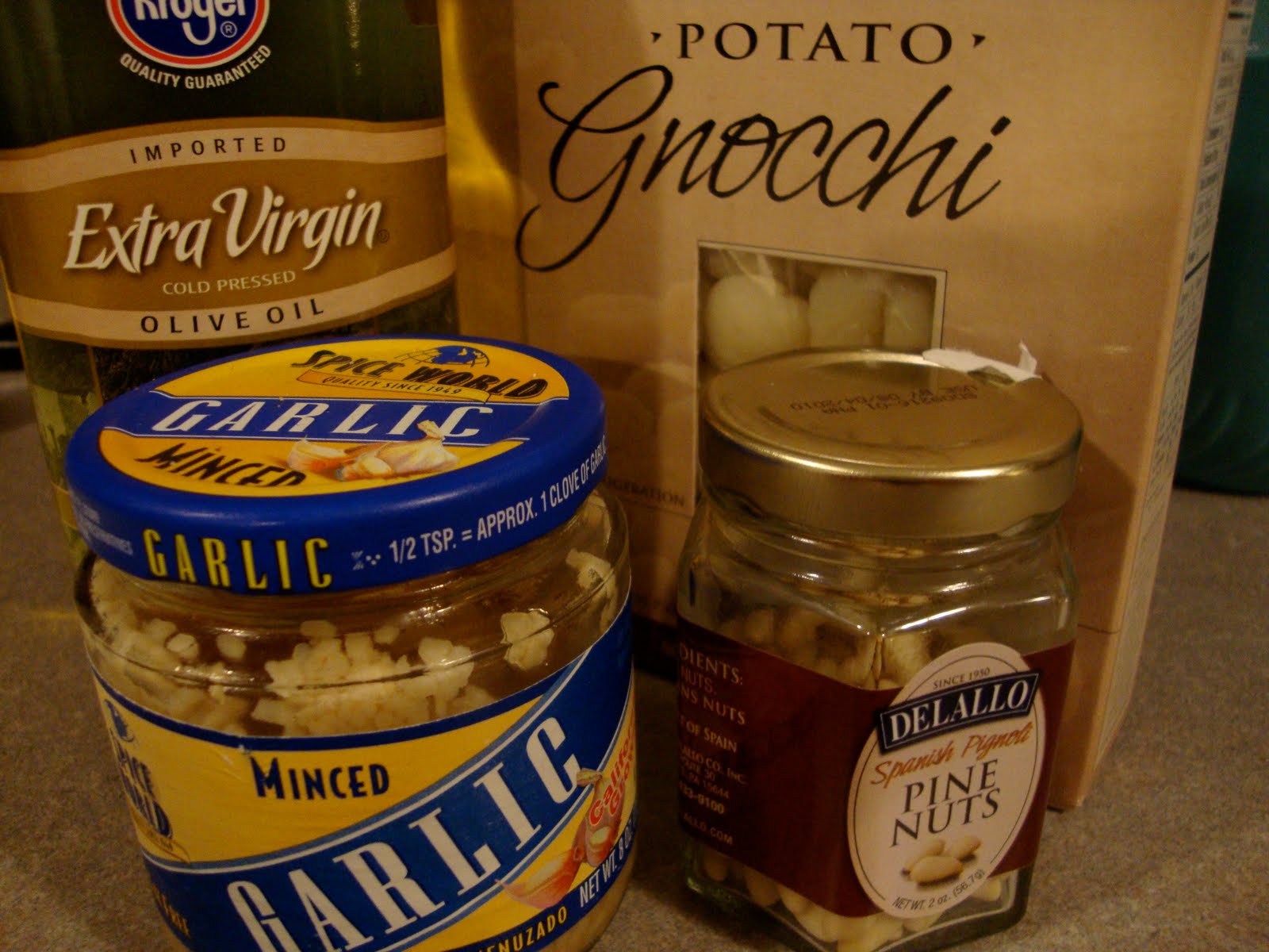 Next, I was on the hunt for shrimp. And I found it. Olive oil, Got it. I was on a roll. Pine nuts. Crap. So I was off to meet my third employee of the night. This time, a crabby old Russian stocking shelves. He quickly pointed out the pine nuts right behind me. And guess what was right above the them? Gnocchi. Not frozen, but in an air-sealed package, which is exactly was I was supposed to get. Note to self #3: read directions carefully.